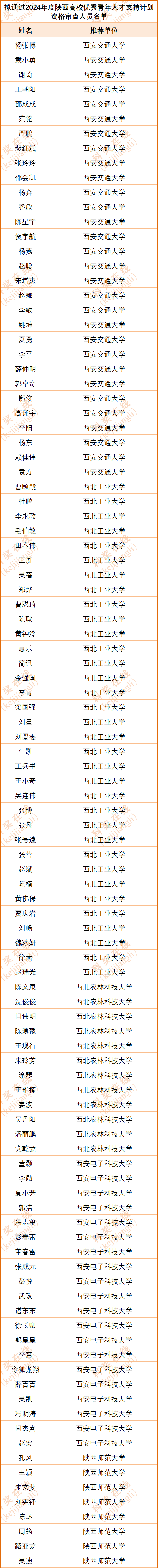 按照陕西高校优秀青年人才支持计划实施方案和2024年度陕西高校优秀青年人才支持计划申报有关工作安排,经相关流程,全省高校拟通过资格审查人员共398人名单: